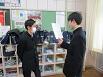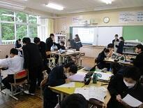 4校時、2階の教室から何やら楽しそうな声が聞こえてきました。1年2組の英語です。内容は「お気に入りの人物(キャラクター)を紹介しよう」です。「This is」から始めて、6文以上(25語以上)でモデル文を参考にしながら紹介文を書いていました。