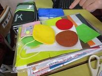 1時間目、3年生の家庭科では「幼児のおもちゃ」づくりに取り組んでいました。色とりどりのフェルト生地で制作する楽しいおもちゃを考えていました。