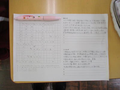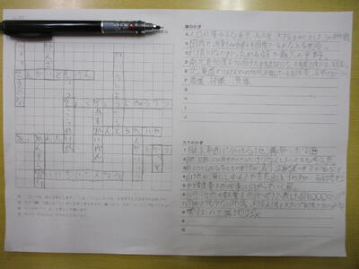 最初に縦横のマス目に言葉を入れてから、質問(かぎ)を作成します。何枚か見せてもらいました。(画質を下げているので文字が見えなくてすみません)