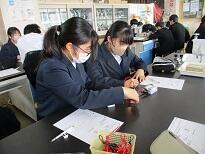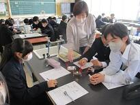 4校時の理科室近くを通ったら、豆電球が光っているのが見えました。2年生の理科で「電圧計で電圧の大きさを測ろう」という授業でした。