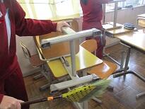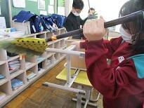 3年生の教室では、ほうきで掃き取ったり雑巾で拭いたりして、ゴミを取り除いていました。