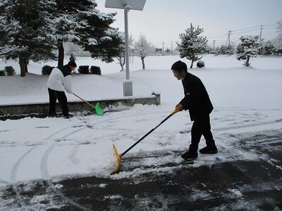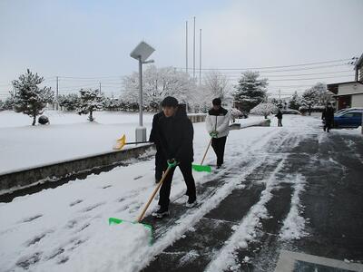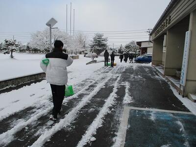 今朝は雪がさらっと降っていました。そんな様子を見て、2年生3名が除雪ボランティアを行っていました。