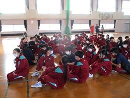 避難後の集会では、担当職員から、地震の時は窓は開けるのか閉めるのか、電気は消すのかどうか、ガラス窓から離れるのが先か机の下に隠れるのが先かについて質問がありました。近くの人と話し合いながら考えています。