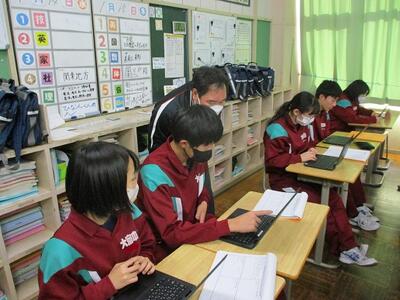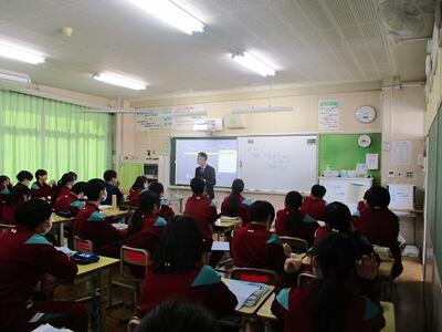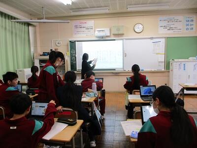3年生では社会科で、最近話題になっている「衆院選」について復習していました。教員の問いかけに答えたことを板書しながら、選挙の仕組みから国会、内閣などについてを確認していました。