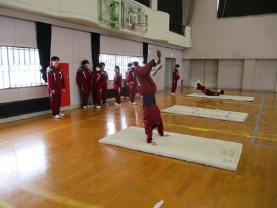 最後は1年2組です。体育のマット運動で、倒立と回転技に挑戦していました。バランスに気を付け、コツがつかめるよう倒立の練習に繰り返し取り組んでいました。