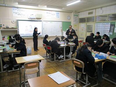 本校ではALTのチアゴ先生がひと月に4回程度来校し、生徒に英語を教えてくれています。2校時の1年1組では、英語科担当教員と一緒に、授業を担当してくれました。