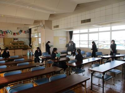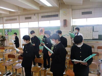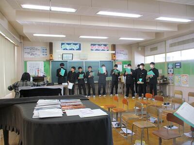 4校時、音楽室から歌声が聞こえてきました。2年生が合唱練習をしています。曲は「変わらないもの」。3年生を送る会で歌う曲です。1、2年生合同で、混声3部合唱に挑戦します。