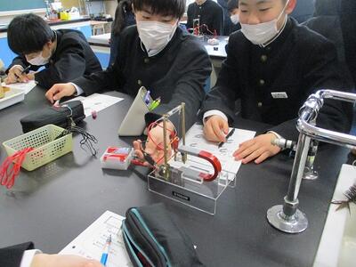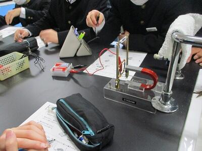2校時、理科室では2年生が「磁界」の学習をしていました。実験装置を組み立て、電流を流すと銅線(コイル)はどのように動くかの実験です。