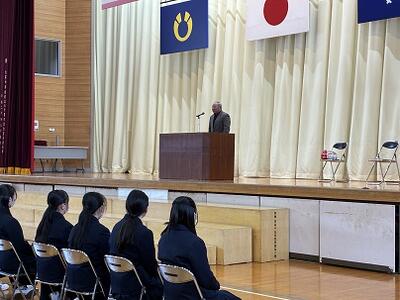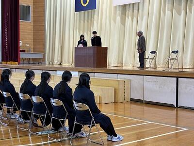 朝は「交通指導員さんへ感謝する会」です。毎朝、学校前の県道を渡る信号機の所で、児童生徒の安全を確保してくだる設楽さんへ、代表生徒がお礼の言葉を述べ、感謝の品をお渡ししました。設楽さん、毎朝ありがとうございます。また、本日はご来校いただきありがとうございました。