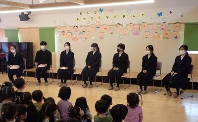 そして放課後は、アルミ缶回収で得た収益金で購入した図鑑を、おおとみ保育園に代表生徒7名でプレゼントに行きました。