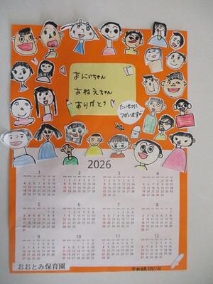 図鑑を代表園児に手渡したあと、園児からの質問に答えるなど、楽しく交流しました。また、手づくりのすてきなカレンダーをいただきました。保育園の皆さま、お忙しいところありがとうございました。