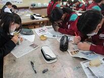 1校時、1年2組の美術では「北村山子ども美術展」の鑑賞をしていました。毎年、地区内各中学校を1週間ずつ巡回し、作品を鑑賞できるようにしています。