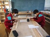 2校時、技術室を覗いてみました。離れなので寒いのかと思いましたが、日が差し込みストーブをたいていて、暖かい部屋での学習でした。1年1組が「本立て」の製作を行っていました。